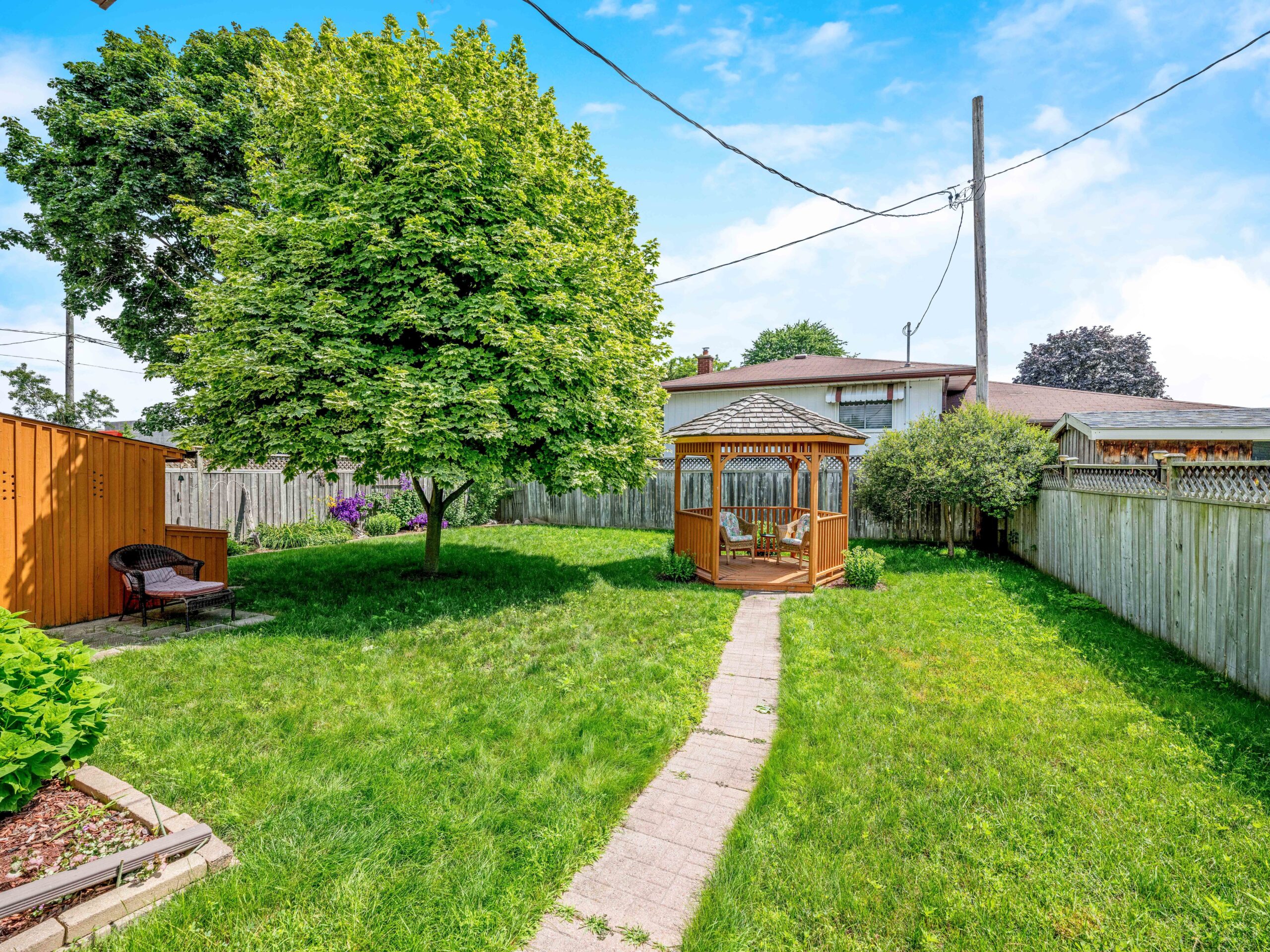 Enjoy the fully fenced backyard with a custom-built Red Cedar gazebo and shed. Recent updates include new windows/doors (2014-2016), roof (2019), furnace/AC (2016), water softener (2019), and gutter guards (2022).