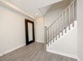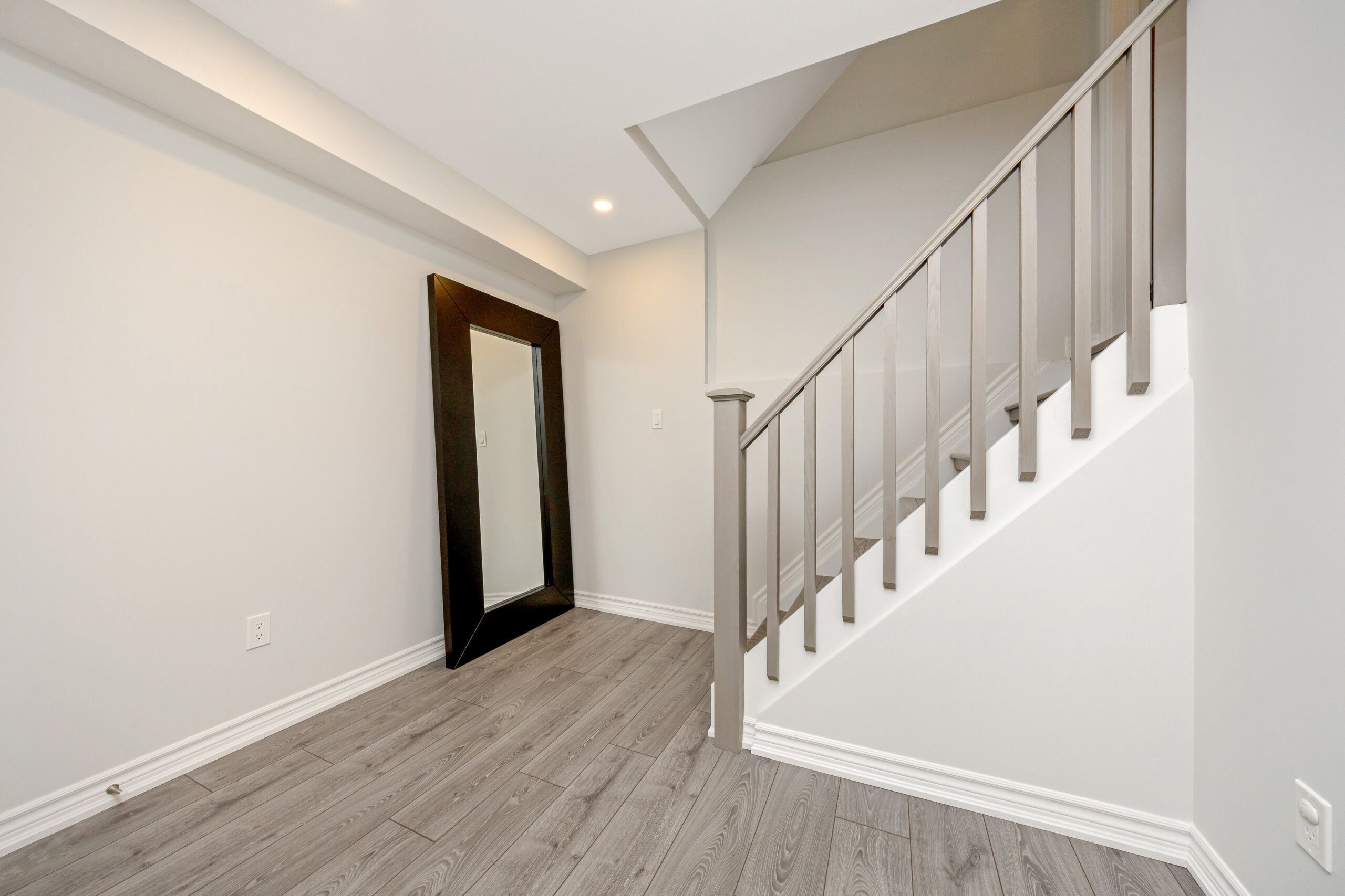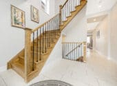 Hardwood stairs with iron pickets lead to the second floor, adding a subtle architectural statement that elevates the space without overpowering it.