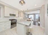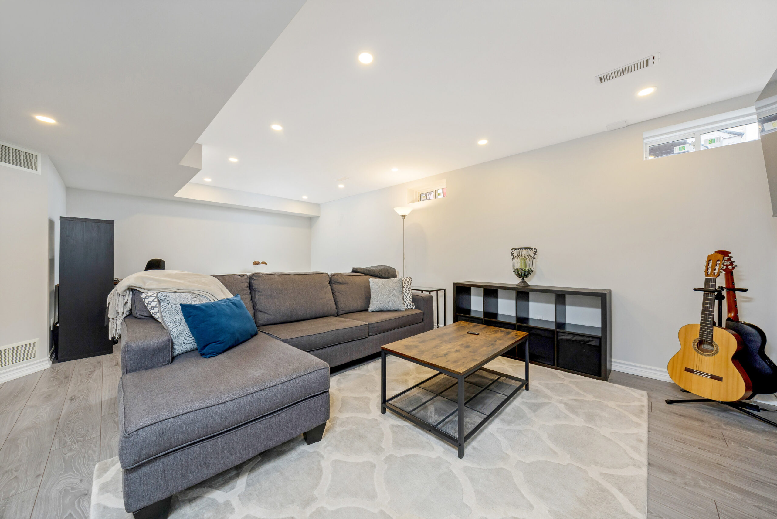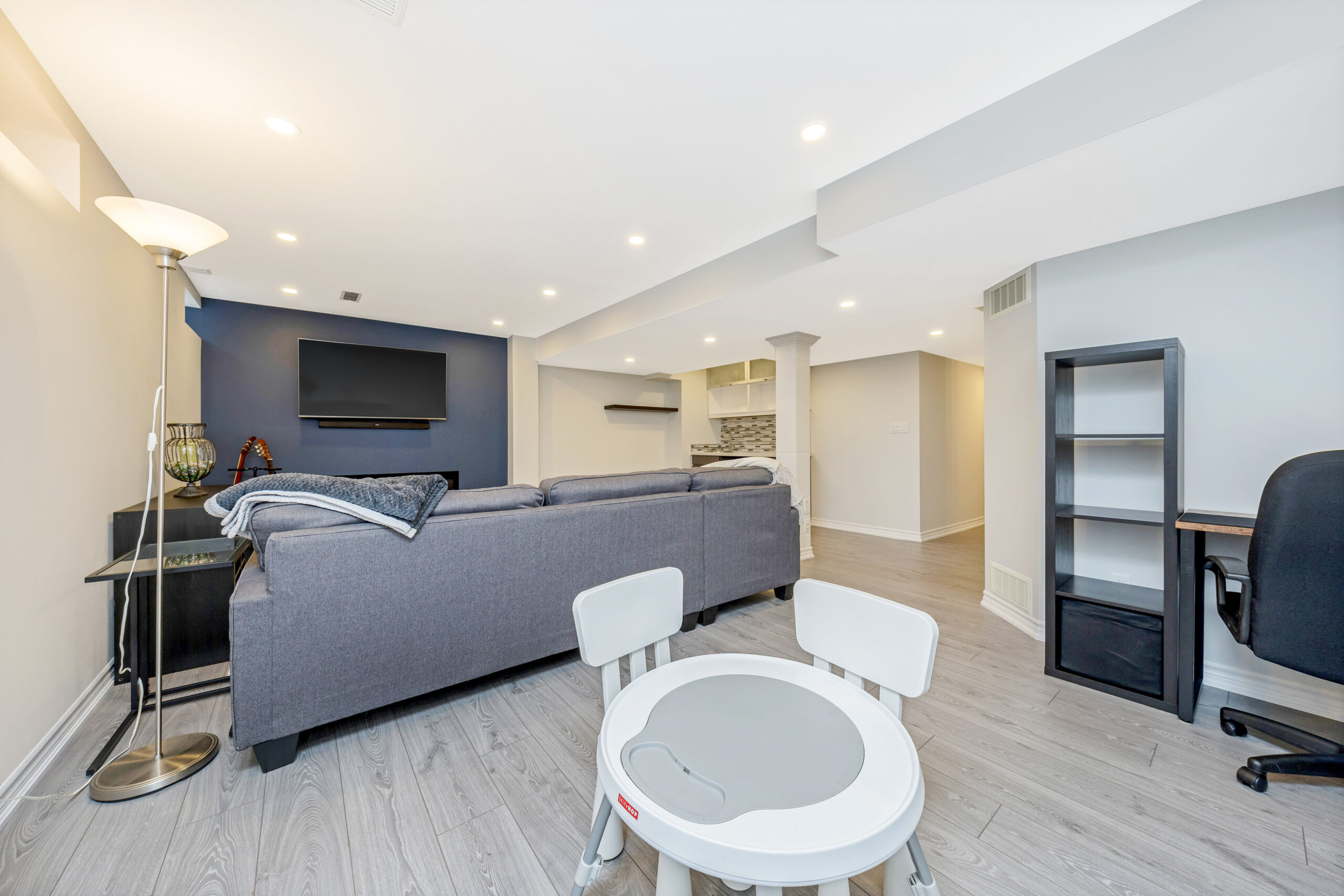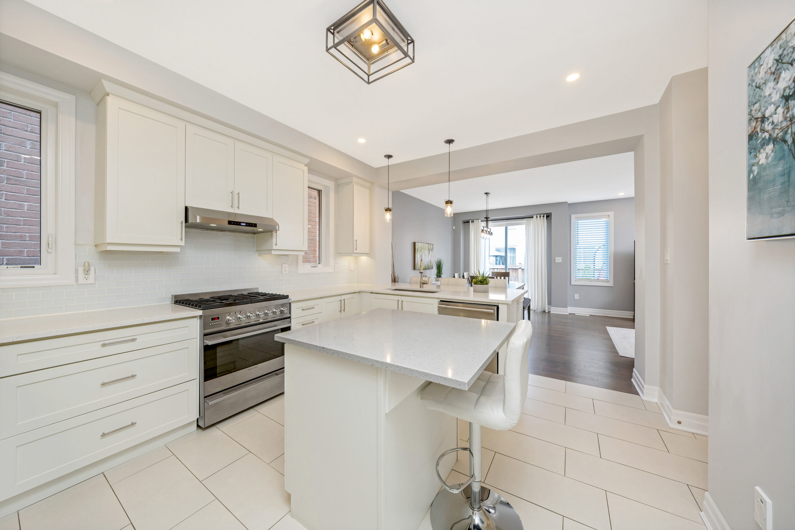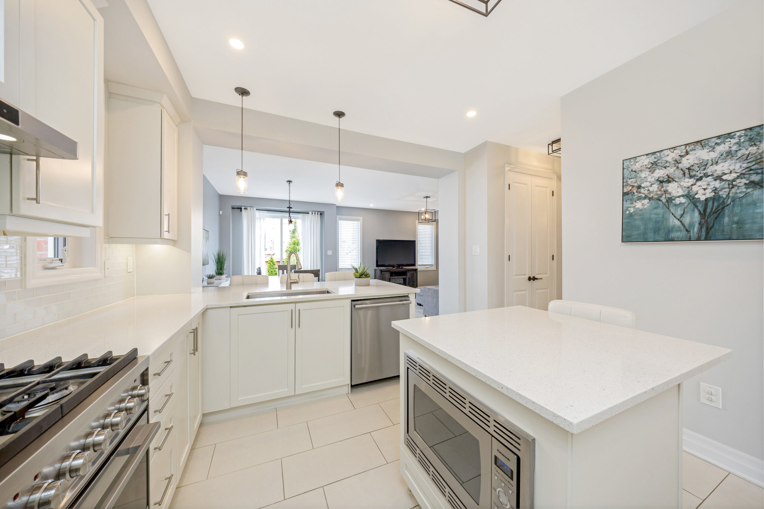 The kitchen anchors it all with a centre island featuring a built-in microwave, upgraded countertops and backsplash, pot lights, and a gas stove ready for serious cooking. It’s equal parts practical and inviting.