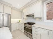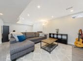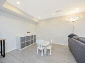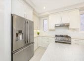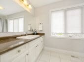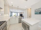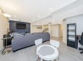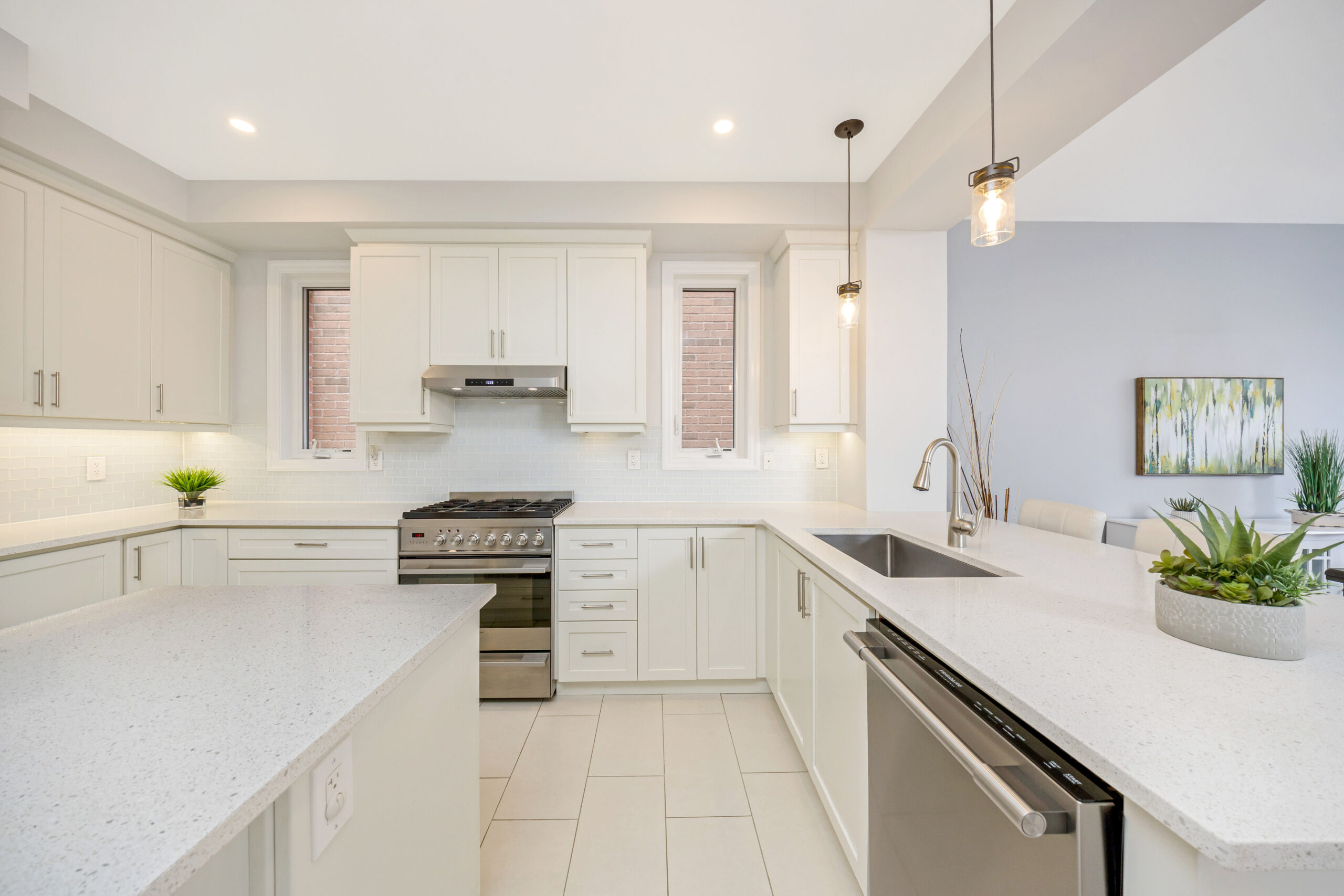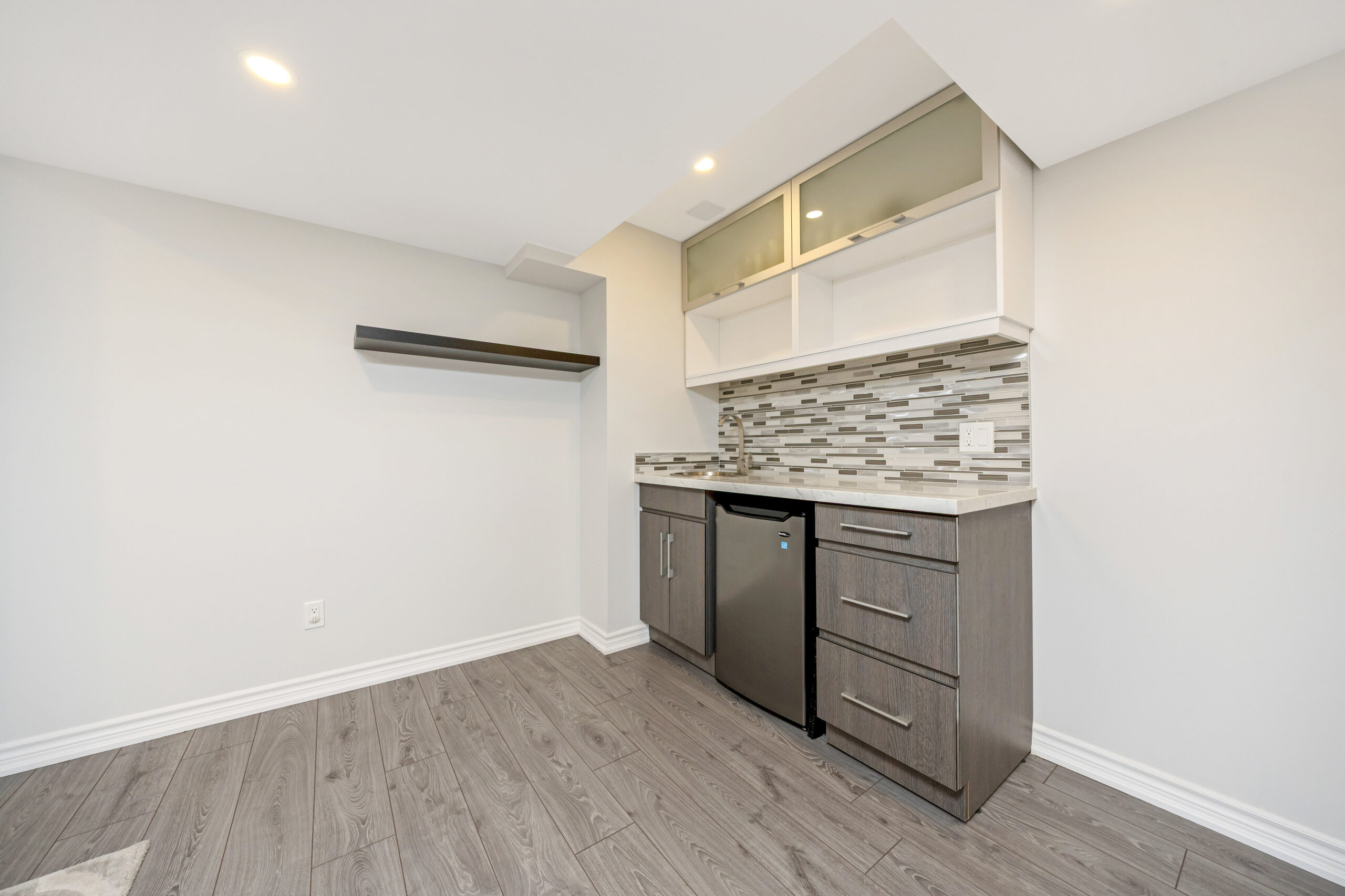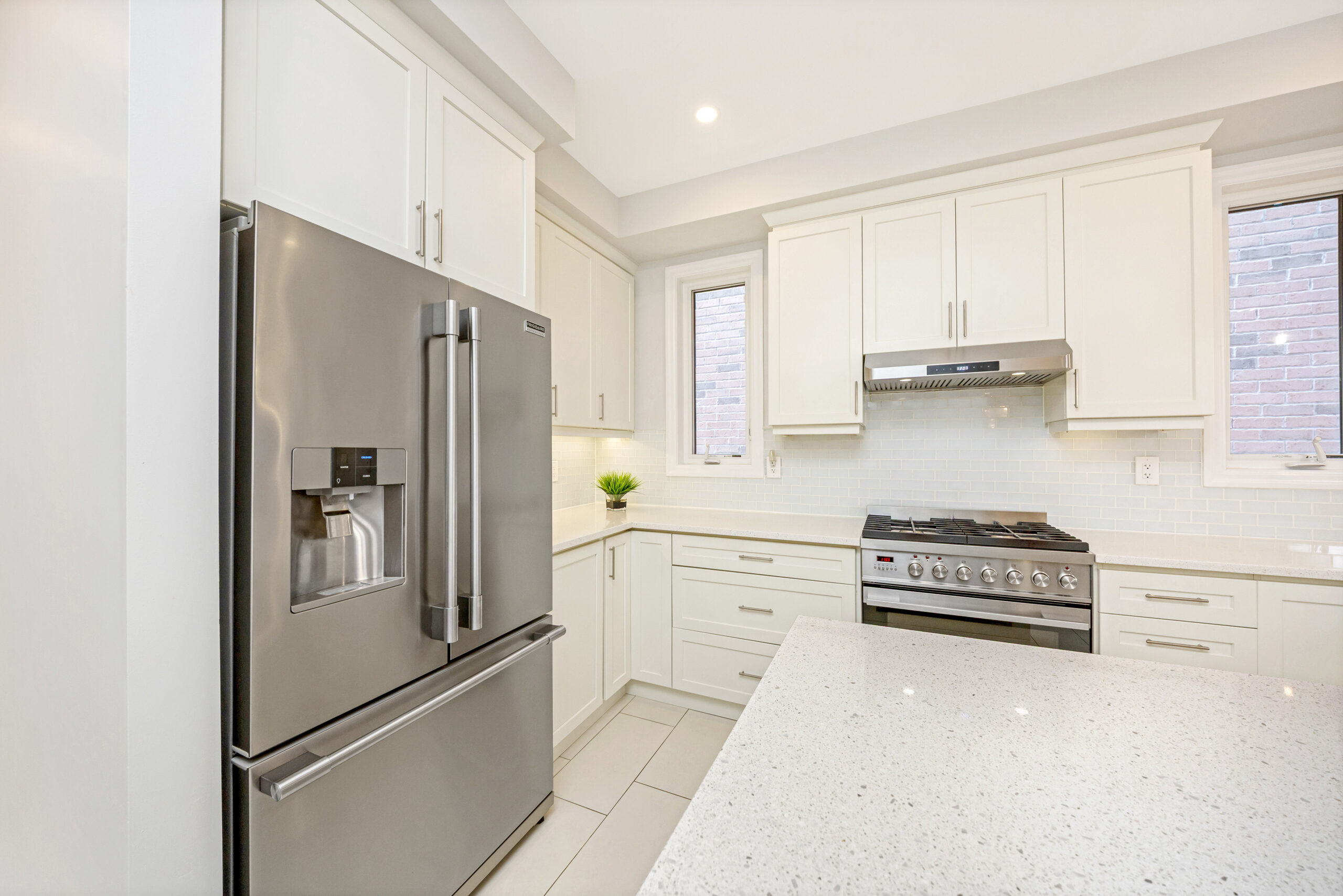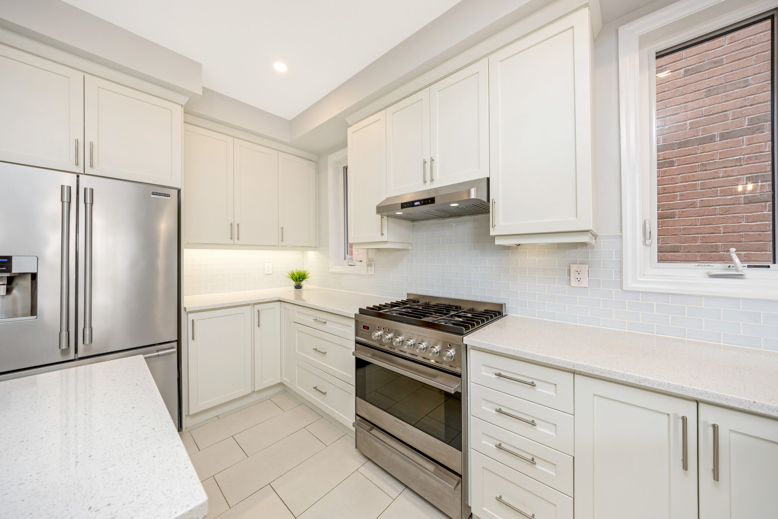 The kitchen anchors it all with a centre island featuring a built-in microwave, upgraded countertops and backsplash, pot lights, and a gas stove ready for serious cooking. It’s equal parts practical and inviting.