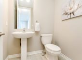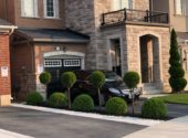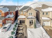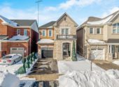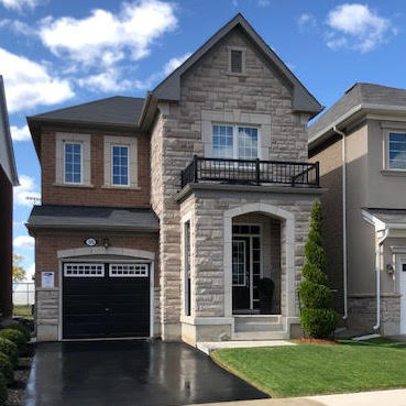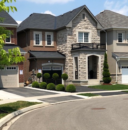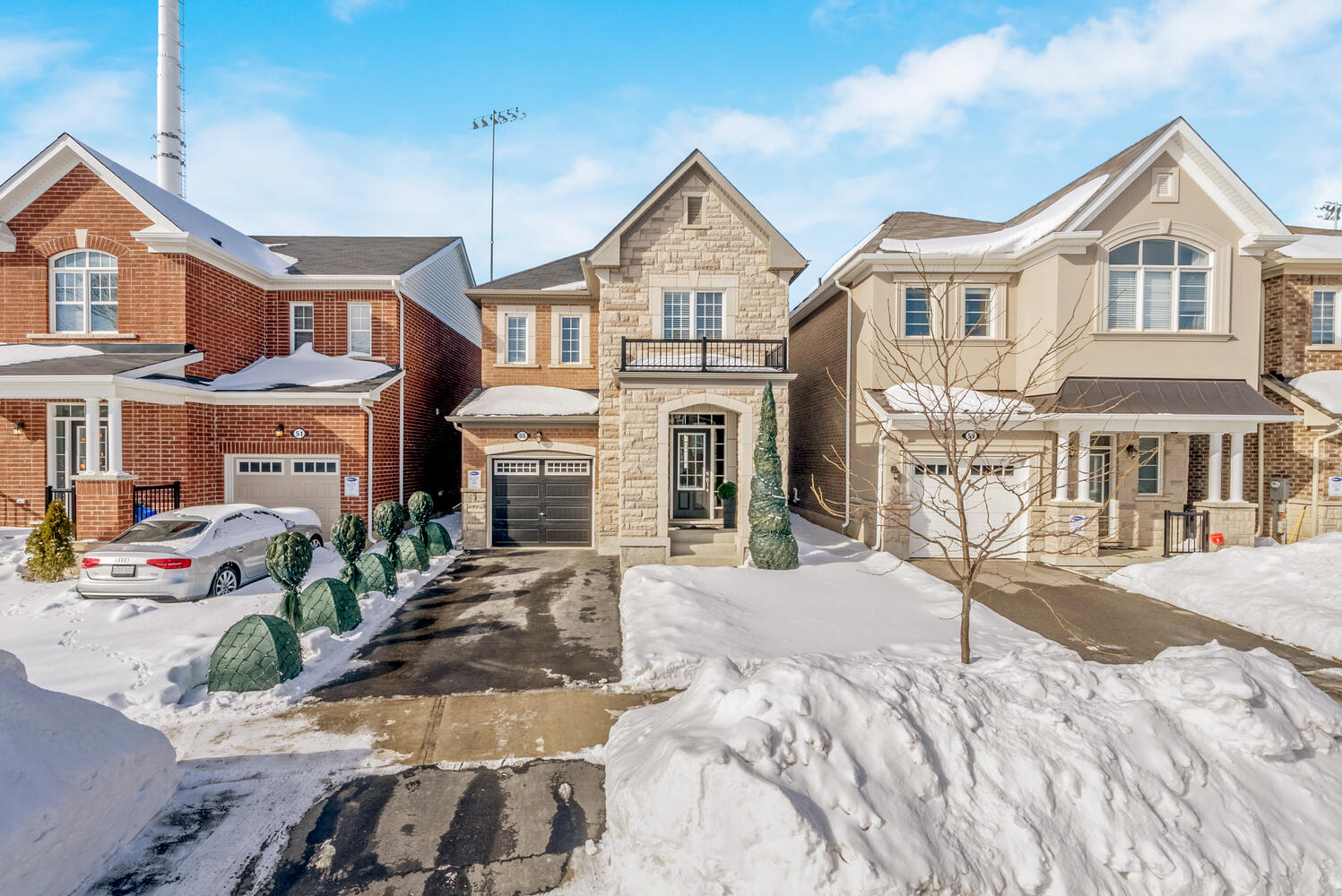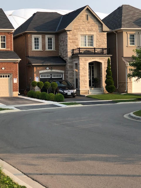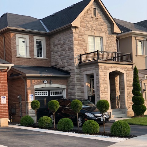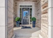Walking up to the home, you’ll see that it’s a French Chateau elevation of the Nobleton model, with brick and stone on the outside. There’s an interlock pathway, plus evergreen shrubbery accents.