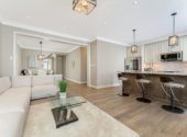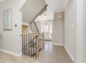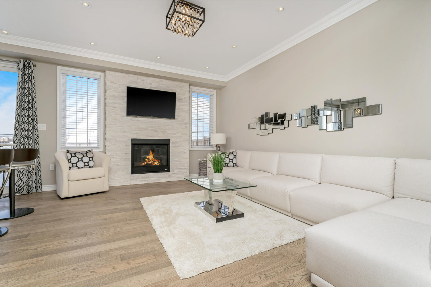 Inside, there are 9-foot tall ceilings, with pot lights and cornice mouldings on the main level. The kitchen is spectacular, with a mix of marble and quartz counters and tasteful, neutral and complementary colour choices. There’s a quartz stone accent wall with a fireplace and television which stays with the home, and the floors are engineered oak and VERY durable.
