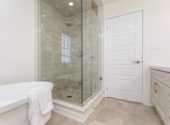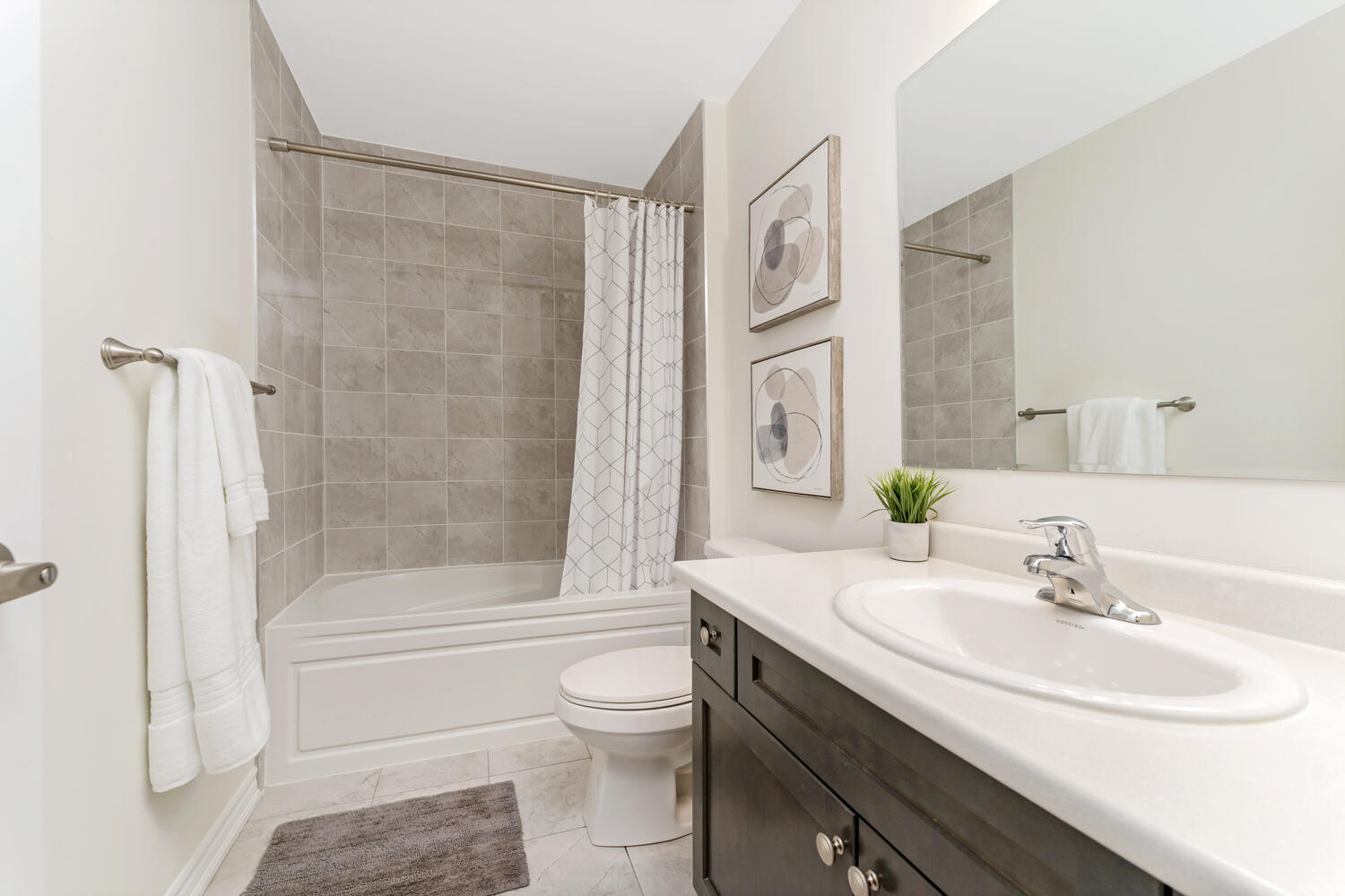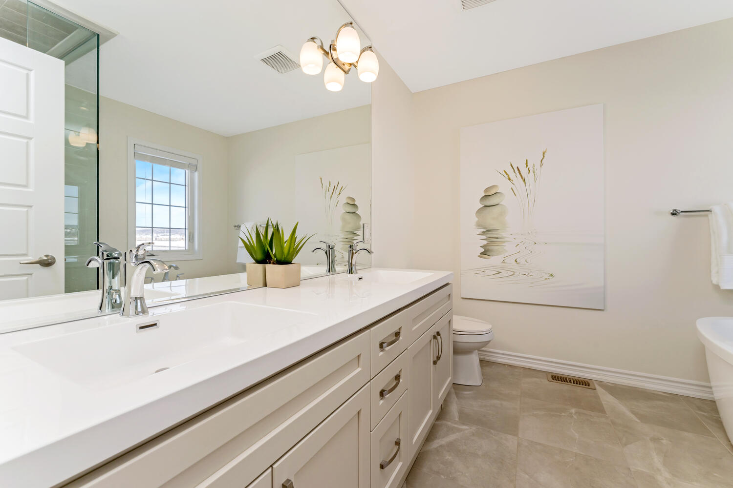 The primary ensuite is the highlight of this level, with a standalone tub, glass shower, double sinks, and a full height mirror.