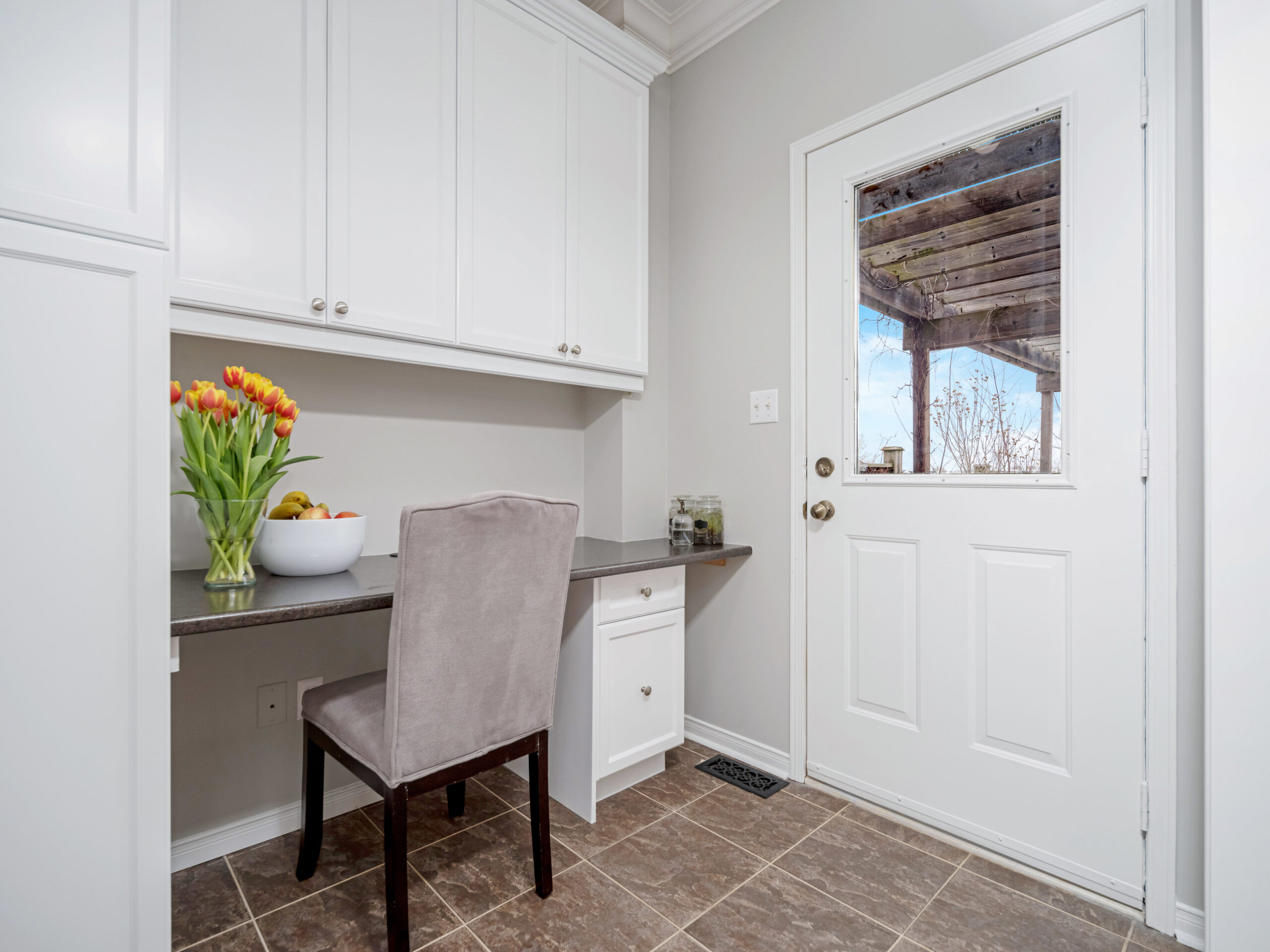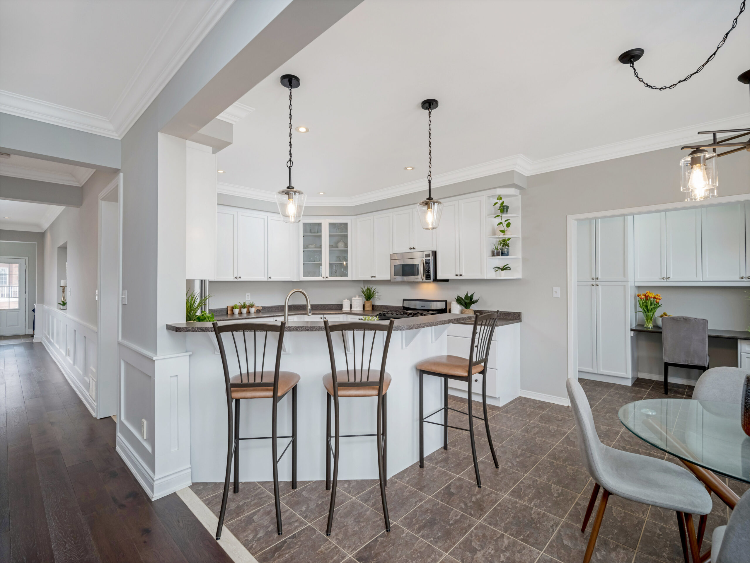 Inside, the house has a large white kitchen with lots of counter space, perfect for cooking and entertaining. The main floor also features an office area, making it convenient for those working from home.