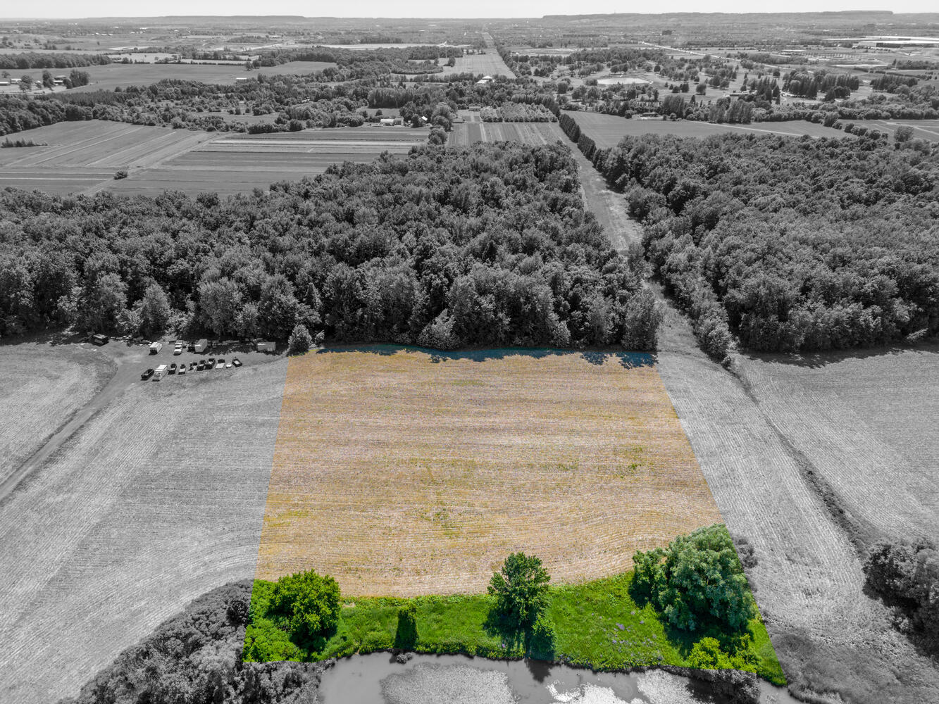 Here’s a view of the full property from a drone above the east side of Trafalgar, looking west, with the approximate land boundaries highlighted: