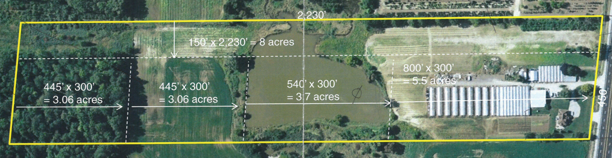 1. A front section of 5.5 acres, which is the most valuable part of the land, directly abutting Trafalgar Road. The frontage along Trafalgar is approximately 450 feet, and includes a detached dwelling of approximately 1,800 square feet in below average condition but habitable, plus two outbuildings which are used for storage. The home is currently occupied by a relative of the owners.