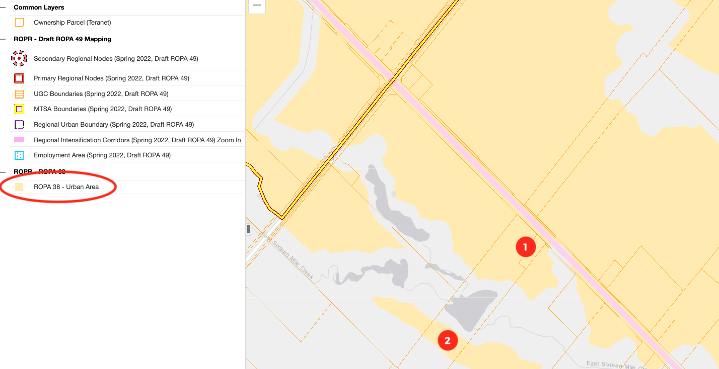 Using the Halton Region online mapping tool with a much closer perspective, it shows the section of land between the pond and the forest (2) as “urban area”, just like the front section (1):
