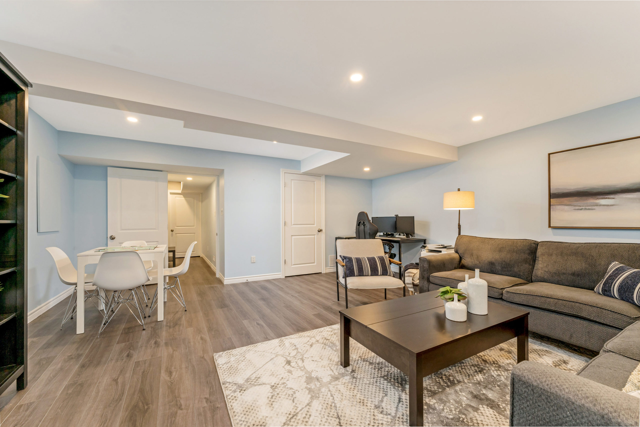 The rec room has been designed with four separate dimmable lighting zones — above the television, in the corner (currently used as a home office), above the door, and above the sitting area. There’s also a large window in this space, plus luxury vinyl plank flooring and a large window facing the yard.