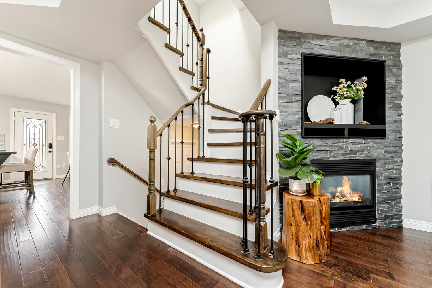 Moving to the main level, featuring a sun-filled living room with a custom stone fireplace to keep you cozy as you watch the sunset. The kitchen features white cabinets, granite countertops and a breakfast island with plenty of space for a breakfast table as well. From your kitchen, you can walk outside to your beautifully landscaped backyard to enjoy the sunshine. It is a nice, quiet space out here to enjoy reading your book under the pergola. Dads will be happy to enjoy the ease of BBQing with a gas line hooked up outside. No hassles of lugging a propane tank to and from the store.