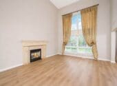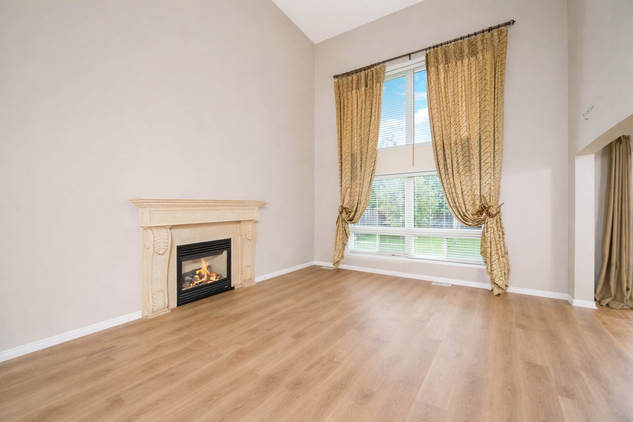 The open-concept main floor is filled with natural light from both sides, highlighting the large rooms and two-storey family room with 16-foot ceilings, a gas fireplace, and large window.