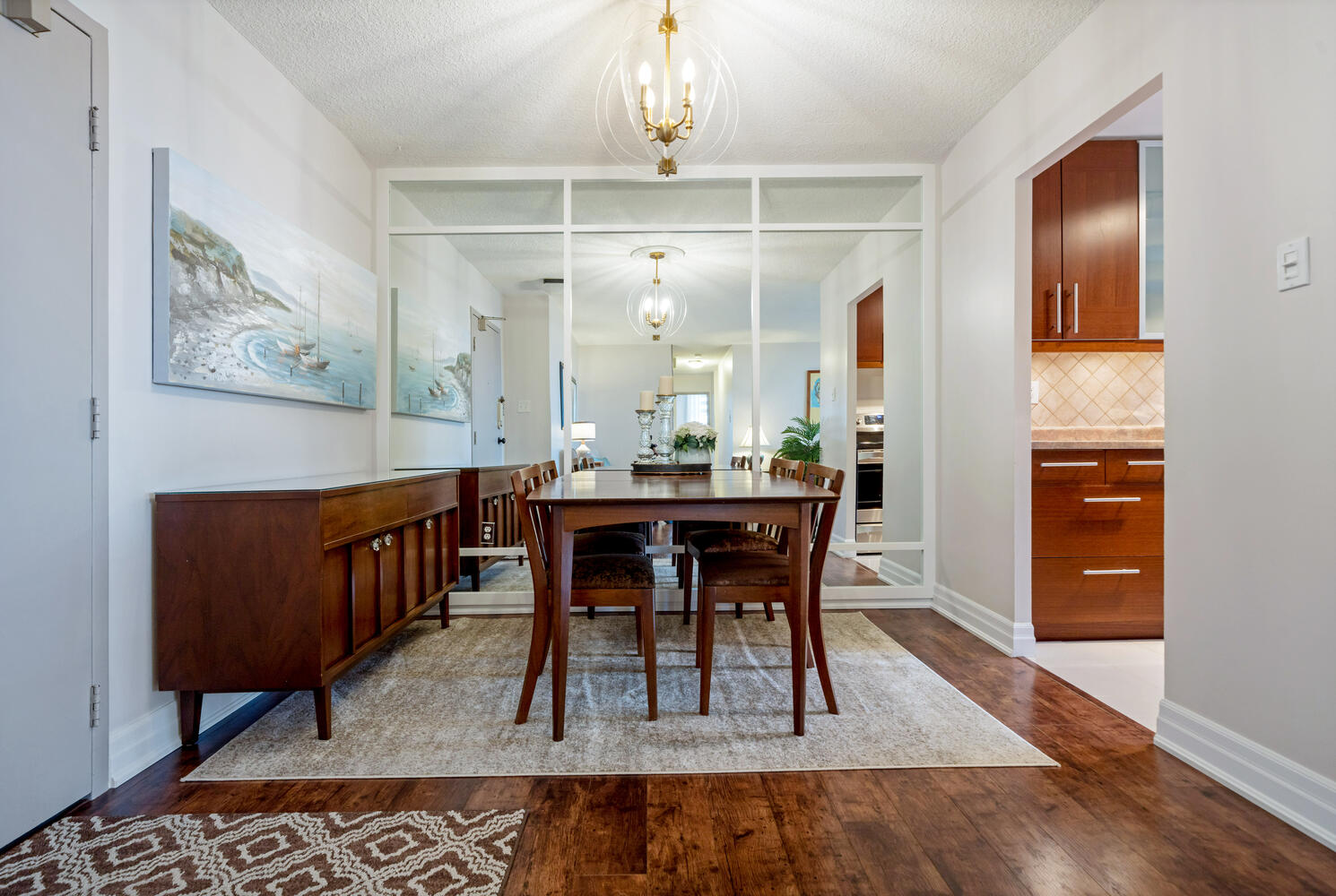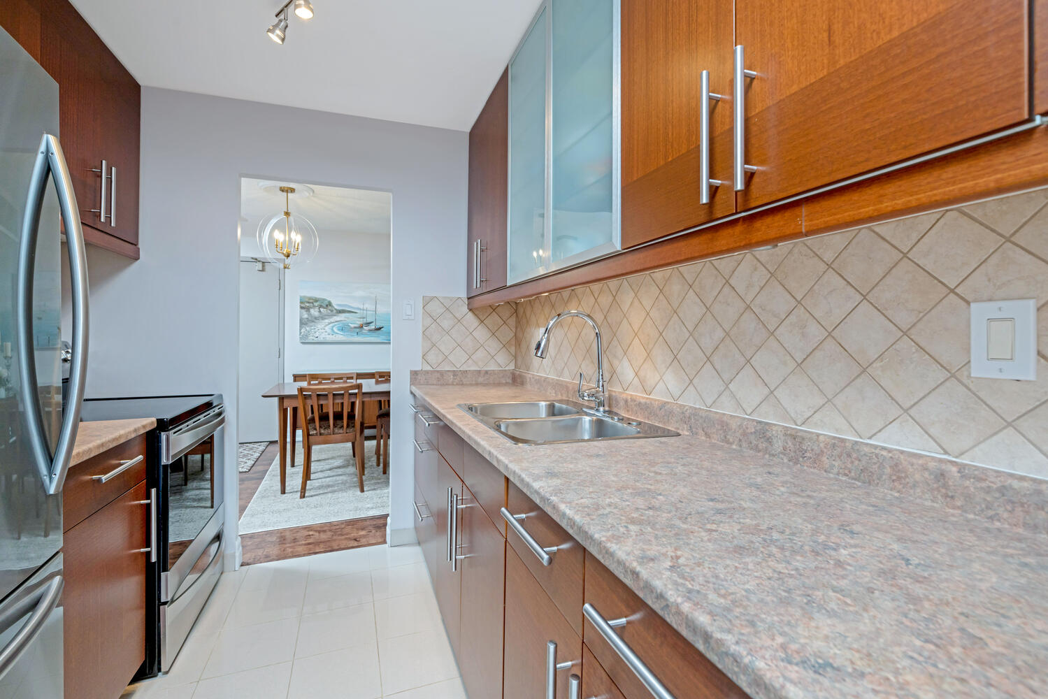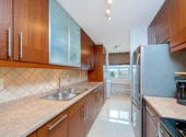 The condo is a true three-bedroom, not a two-plus-den that we see in other buildings. There’s a separate dining area with a mirrored accent wall, a living room with an added storm/screen door to the massive 100+ square foot balcony for fresh air, and an updated kitchen with quality stainless steel appliances.